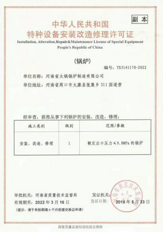 河南省太鍋鍋爐制造有限公司(原河南省太康鍋爐廠始建于1976年)始建于70年代初,經(jīng)40多年的艱辛探索,靠科技興業(yè),走科學(xué)管理之路,現(xiàn)已發(fā)展成為承接制造、安裝、設(shè)計(jì)大、中型供熱系統(tǒng),生產(chǎn):SZS燃油燃?xì)庹羝仩t、燃煤蒸汽鍋爐、燃油鍋爐、燃?xì)忮仩t、電加熱鍋爐、生物質(zhì)鍋爐、茶水鍋爐、有機(jī)熱載體鍋爐、熱風(fēng)鍋爐,蒸壓釜、燃油蒸汽鍋爐、燃?xì)庹羝仩t、燃油熱水鍋爐、燃?xì)鉄崴仩t并承擔(dān)安裝120噸熱水鍋爐、蒸汽鍋爐,生物質(zhì)鍋爐,加工制造一、二類蒸壓釜、壓力容器,化工機(jī)械的省一級**企業(yè)。